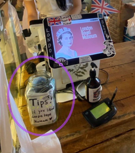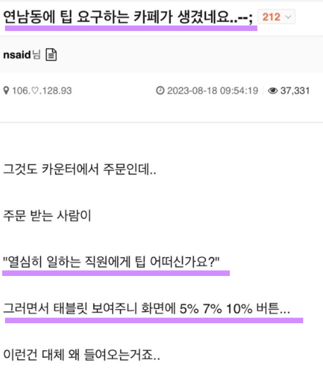 다른 커뮤니티에선 연남동에 위치한 카페에서 팁을 요구하는 사례가 소개되었다. 주문하는 도중 직원이 태블릿을 보여주면서 "열심히 일하는 직원에게 팁 어떠신가요?"라며 5%, 7%, 10% 버튼이 나타났다는 후기가 나왔다. 이러한 직접적인 팁 요구로 논란이 불거졌다.